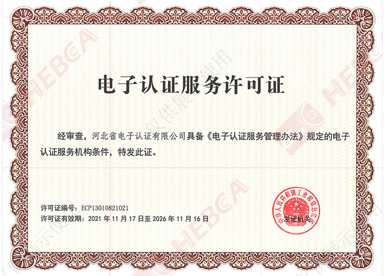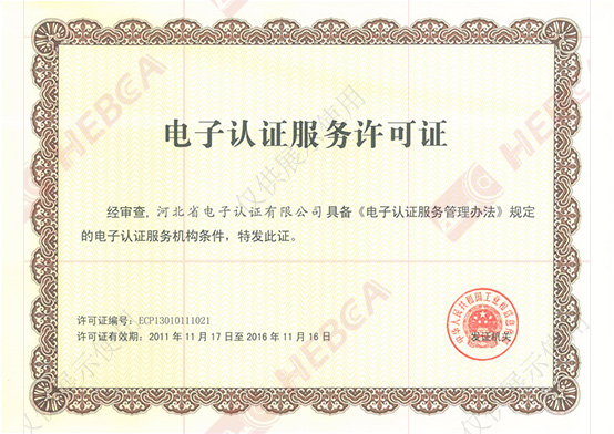 2011年11月17日河北省電子認證有限公司取得國家工業和信息化部換發的《電子認證服務許可證》。